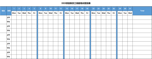 8. 由于新員工在培訓(xùn)期尚未正式分配客服受理系統(tǒng)工號,無法按照績效制度-考勤管理制度中的規(guī)定-以登陸和退出系統(tǒng)的時間作為考勤時間,因而可使用簽到表作為約束和記錄日??记诘墓ぞ?,參考用表《XXX項目新員工崗前培訓(xùn)簽到表》見下。