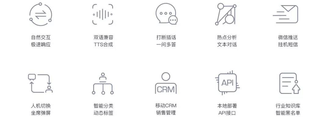 UCC電話機器人,基本包括:自然交互、極速響應(yīng)、雙語兼容、TTS合成、打斷插話、一問多答、熱點分析、文本對話、微信推送、掛機短信、人機切換、坐席彈屏、智能分類、動態(tài)標(biāo)簽、移動CRM、營銷管理、本地部署、API接口、行業(yè)知識庫、智能黑名單等20多項功能。