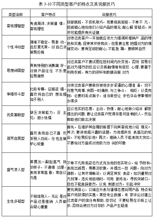表3-10介紹了常見的十種不同類型客戶的主要特點,以及 相對應(yīng)的說服技巧。