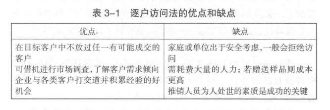 指推銷人員在所選擇的目標客戶群活動區(qū)域內(nèi),對目標客戶進行挨家挨戶的訪問。采用此法成功開發(fā)客戶的數(shù)量與訪問人數(shù)成正比,要想獲得更多客戶,就得訪問更多的人。逐戶訪問法本身存在一定的優(yōu)點和缺點,如表3-1所示,需要進行合理的應(yīng)用。