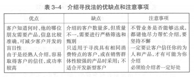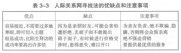 指將自己接觸過的親戚、朋友列出清單,然后拜訪,爭取在其中尋找自己的客戶。每個人都有一個關(guān)系網(wǎng),如同學(xué)、同鄉(xiāng)、同事等,因此可以依靠人際關(guān)系網(wǎng)進行客戶開發(fā)。人際關(guān)系網(wǎng)尋找法的優(yōu)點、缺點以及在運用時的注意事項,如表3-3所zK。