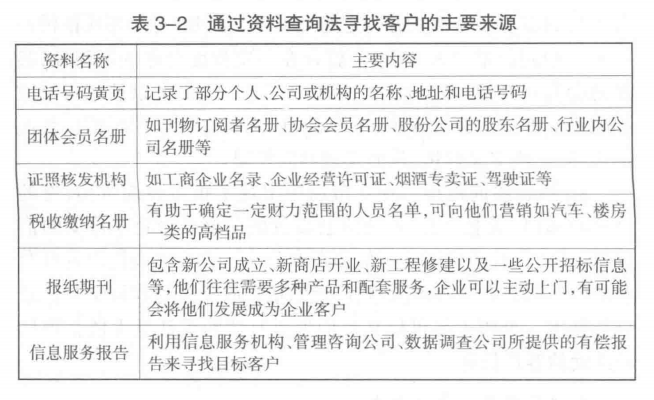指通過查詢與目標客戶相關(guān)的資料來尋找目標客戶,可供查詢的資料如表3-2所示。