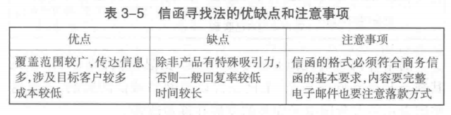 信函尋找法是以郵寄產(chǎn)品目錄、宣傳單、插頁等方式,向目標客戶介紹公司產(chǎn)品或者服務(wù),以及訂購和聯(lián)系的方式,以便尋找客戶。該方法優(yōu)缺點和注意事項如表3-5所示。