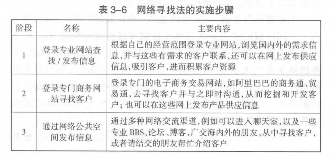 網(wǎng)絡(luò)尋找法指借助互聯(lián)網(wǎng)宣傳、介紹自己的產(chǎn)品從而尋找客戶的方法。隨著上網(wǎng)人數(shù)的日漸增多,企業(yè)很容易在網(wǎng)絡(luò)上找到客戶,因此該方法前景廣闊,其實施方式如表3-6所示。