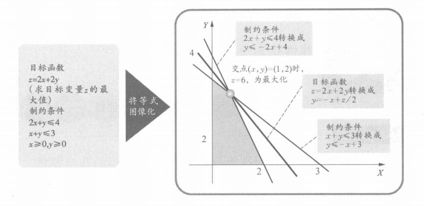 不喜歡公式的人大概對到此為止的解說敬而遠(yuǎn)之,但其實(shí),簡單的線性規(guī)劃問題早已在高中數(shù)學(xué)中學(xué)過。不知道你對下頁圖還有印象嗎?