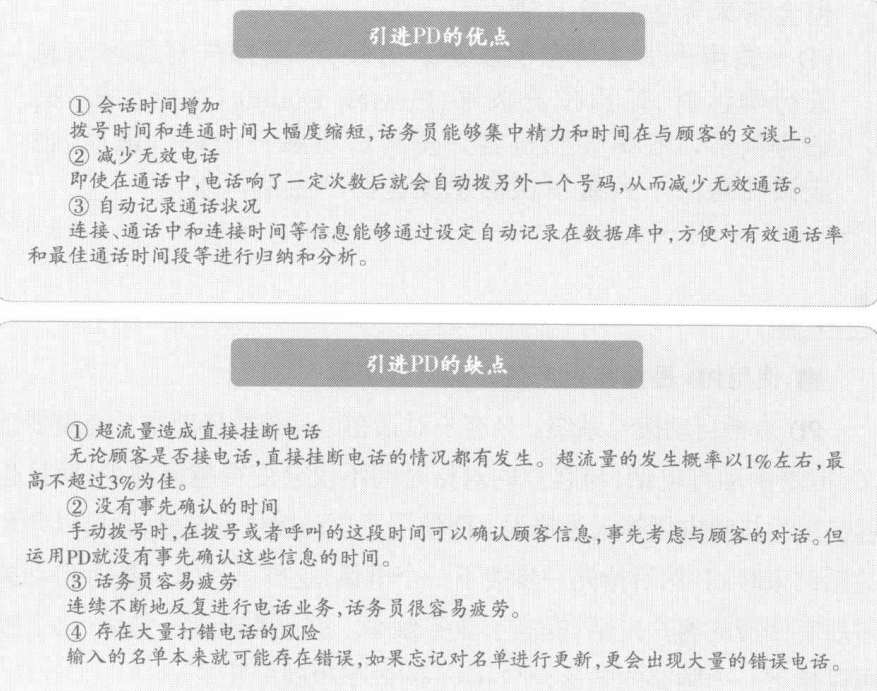 所謂PD就是PredictiveDailing的簡稱,即自動撥號系統(tǒng)°使用PD可使業(yè)務(wù)更有效率,然而隨著超流量等問題的發(fā)生,也會帶來無故掛斷等缺點。PD不適用于少量信息的發(fā)送。另外,需要預(yù)先對顧客信息進行確認(rèn)時,使用預(yù)覽撥號(PreviewDialing)功能比較好,話務(wù)員可以在事先預(yù)覽客戶資料后再展開對話。最后,也應(yīng)該注意由于大量錯誤信息發(fā)送而產(chǎn)生的風(fēng)險。