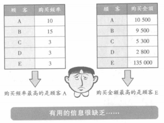 既然有多變量解析,當(dāng)然也就有一個(gè)變量或是兩個(gè)變量的解析。我們把變量是一個(gè)的叫做單變量解析或者一變量解析,把變量是兩個(gè)的叫做二變量解析。用一變量解析和二變量解析,可以通過(guò)查頻率分布和散布圖得到一些信息。這些方法非常簡(jiǎn)單,也比較容易理解,但另一方面,因?yàn)樽兞刻?,只能看到事物的一個(gè)或兩個(gè)方面,所以得出的結(jié)果一般都沒(méi)什么意義。例如上文所列舉的顧客數(shù)據(jù),如果一個(gè)一個(gè)變量地看,購(gòu)買頻率最高的是A,購(gòu)買金額最高的是E。只能得到這樣的數(shù)據(jù)。