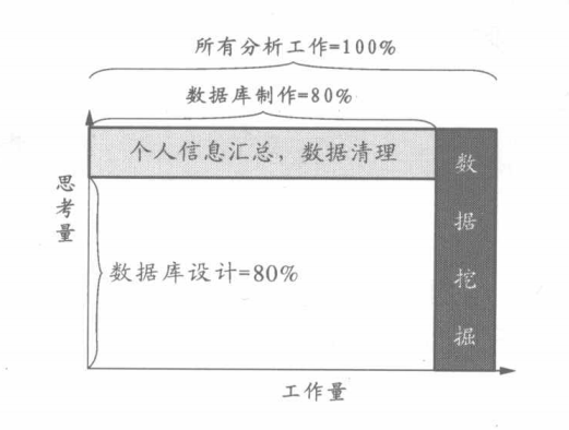 數(shù)據(jù)庫的設(shè)計(jì)是從已有的數(shù)據(jù)中,找出構(gòu)建顧客行動(dòng)模式所必需的信息。該數(shù)據(jù)庫中的數(shù)據(jù)是顧客行動(dòng)模式的輸入數(shù)據(jù),因此會(huì)直接影響模式的精度,所以數(shù)據(jù)庫設(shè)計(jì)是所有分析工作中最重要的。要對(duì)數(shù)據(jù)進(jìn)行細(xì)查,就應(yīng)清楚地將能夠使用的數(shù)據(jù)和不能夠使用的數(shù)據(jù)分開。對(duì)于這項(xiàng)工作,不僅需要有縝密的思考能力,還要有在過去的經(jīng)驗(yàn)及事物的基礎(chǔ)上進(jìn)行類推的能力。可以說在數(shù)據(jù)庫的做成中數(shù)據(jù)庫的設(shè)計(jì)就需要占用其80%的思考量(見下圖)。