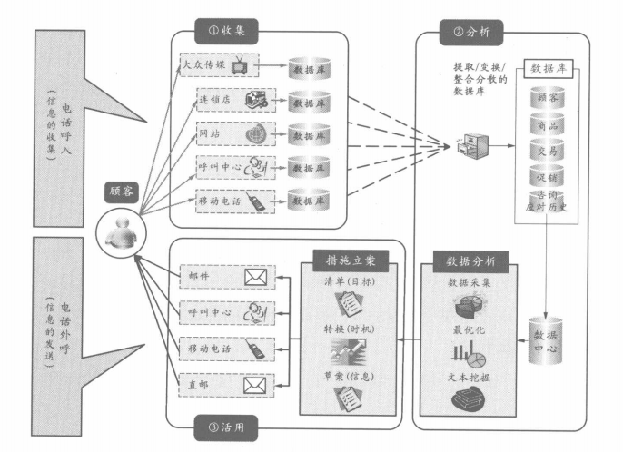 通過電話呼入收集的信息被儲(chǔ)存在數(shù)據(jù)庫中。對(duì)儲(chǔ)存的信息進(jìn)行分析,做出營(yíng)銷策劃,以該策劃為基礎(chǔ)進(jìn)行人才培養(yǎng)和環(huán)境整備,來實(shí)行電話外呼和管理。用電話外呼刺激顧客,用電話呼入再收集顧客反應(yīng)的數(shù)據(jù),根據(jù)分析,活用此數(shù)據(jù)來實(shí)施更高精密度的電話外呼。