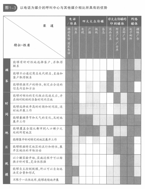 圖1-3是為了幫助大家了解電話(huà)作為信息輸出渠道的特征和性質(zhì),把電話(huà)和其他的渠道進(jìn)行的一次綜合、客觀(guān)比較。首先,把四大大眾 傳媒(電視、廣播、報(bào)紙、雜志)在廣泛向顧客傳播大量信息的同時(shí),卻很 難有目標(biāo)地針對(duì)個(gè)別客戶(hù),銷(xiāo)售活動(dòng)也只能停留在店鋪、代理店等間接的溝通渠道上。其次,這些媒體必須以一定范圍為單位進(jìn)行營(yíng)銷(xiāo),花費(fèi)比較大,出稿的時(shí)間、地域、形式也受到限制。第三,要達(dá)到提高產(chǎn)品的認(rèn)知度和品牌形象等潛在效果的目的,如果宣傳只停留在間接層面上的話(huà),效果預(yù)測(cè)比較困難。
