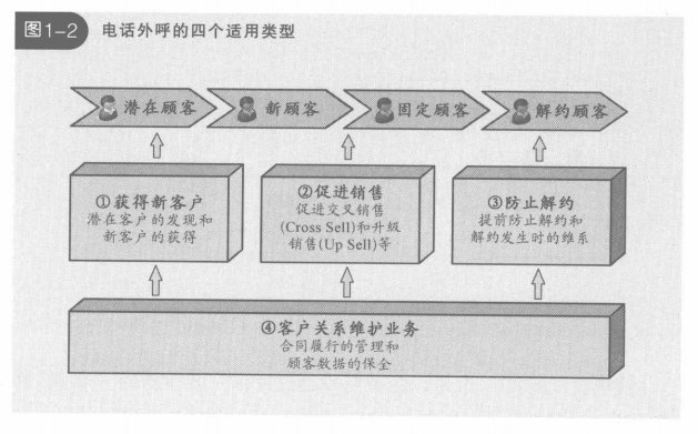 但是,也存在上述這4個(gè)類(lèi)型以外的電話(huà)外呼內(nèi)容。例如,通告形 式的電話(huà)外呼,告知顧客新組織的成立、人事變動(dòng)、公司名稱(chēng)的變更等等。這些都是和客戶(hù)生命周期無(wú)關(guān)的業(yè)務(wù),如果一定要分類(lèi)的話(huà),可以 認(rèn)為是客戶(hù)關(guān)系維護(hù)業(yè)務(wù)中的一種。