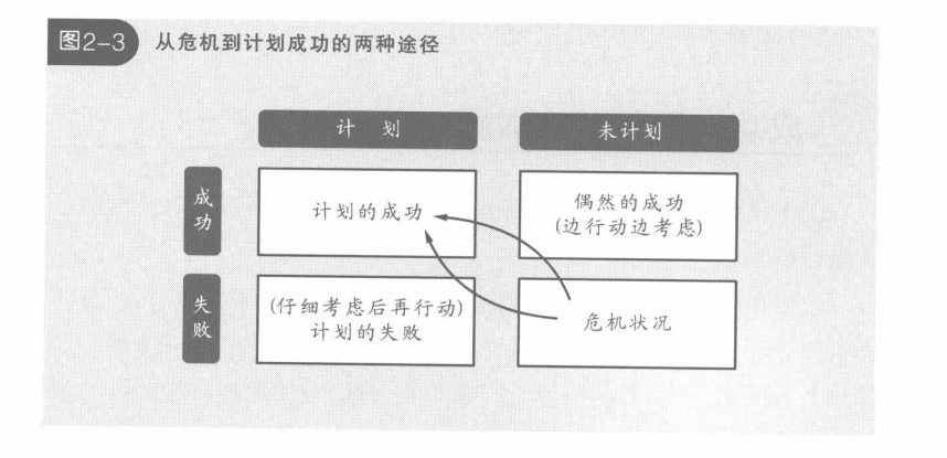如圖2-3所示就更形象化了。仔細(xì)考慮后再行動(dòng)的箭頭表明了為擺脫危機(jī)狀況制定計(jì)劃,不斷地想辦法進(jìn)行計(jì)劃的修正,和運(yùn)用之后走向成功的捷徑。另一方面,邊行動(dòng)邊考慮的箭頭表明從偶爾到手的成功中發(fā)現(xiàn)一定的規(guī)律,把它變?yōu)槊卦E,以后帶著它有計(jì)劃地走向成功的道路。為了使外呼獲得成功,重要的不是在兩條道路中選擇其中一條,而是兩方面同時(shí)進(jìn)行。