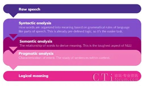NLU使用幾種方法來導航這些復雜性。句法分析運用了句子結構(句法)的規(guī)則,來推導出所說內容的部分含義。語義分析決定了詞義的關系。語用分析則著眼于句子語境來識別意圖。這些分析技術的結合,使原始語音變成邏輯意義。