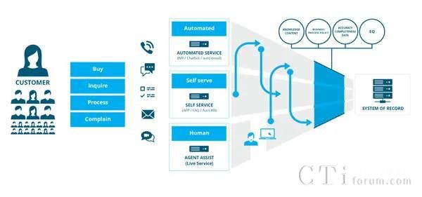 這些服務(wù)承擔(dān)者可以處理一個(gè)或多個(gè)服務(wù)。例如,人們可以進(jìn)行一對一的電話通話或視頻通話,發(fā)送電子郵件,或進(jìn)行實(shí)時(shí)的人對人聊天會話。自助服務(wù)載體包括web、app、faq、知識庫等。自動(dòng)服務(wù)載體包括IVR、IVA、聊天機(jī)器人、自動(dòng)郵件等。