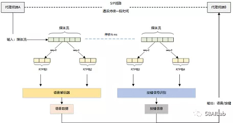 智能語音機(jī)器人基于SIP線路實現(xiàn)的呼出場景下,用戶電話按鍵信號捕獲需要借助SIP線路實現(xiàn),整體流程如圖2,在代理終端A(用戶)與代理終端B(機(jī)器人)持續(xù)通話的過程中,用戶會持續(xù)向機(jī)器人發(fā)送媒體流,機(jī)器人在接收媒體流時會判斷當(dāng)前流屬于語音流還是按鍵信號,如果當(dāng)前流屬于語音流則經(jīng)過語音解碼器,如果是按鍵信號則經(jīng)過按鍵信號識別模塊,最終產(chǎn)生語音數(shù)據(jù)/按鍵信息再做下一步處理。