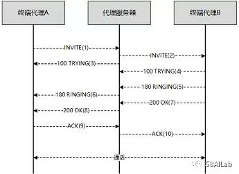 SIP(Session Initiation Protocol)是一種信令協(xié)議,用于初始化、管理和終止網(wǎng)絡(luò)語音和視頻會話,如圖5,終端代理A為主叫代理,終端代理B為被叫代理,A與B的會話建立流程如下: