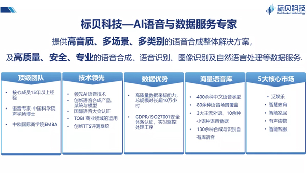 接下來介紹下我們所做的一些工作,標貝科技專注于提供人工智能數(shù)據(jù)的服務,同時也提供高音質(zhì),多場景,多類別語音合成的整體解決方案。我們希望在做高質(zhì)量語音合成數(shù)據(jù)的同時,能夠為中小型企業(yè)提供更多優(yōu)質(zhì)的解決方案,幫助解決他們的問題。