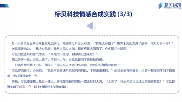 還有涉及到語音合成的挑戰(zhàn):不同說話人之間的情感遷移,例如對于沒有情感的聲音,可不可以通過一些類比或者遷移技術(shù),把別人的情感和非情感的差異,在一個沒有情感數(shù)據(jù)的聲音上進行呈現(xiàn);小數(shù)據(jù)量的個性化情感合成,我們前段時間推出了標貝留聲機的一個小數(shù)據(jù)的個性化合成,這里面并沒有涉及到情感。如果我們還是在這個數(shù)據(jù)規(guī)模下,每種情感加上一句話,是不是可以實現(xiàn)?