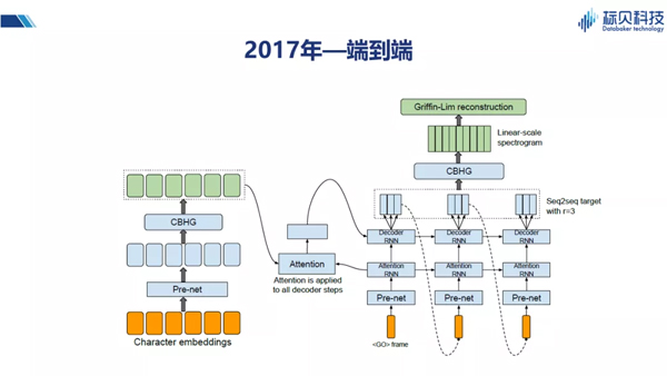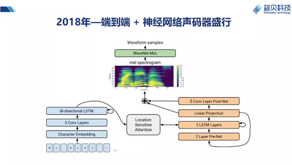 2018年,大家將兩種網(wǎng)絡結(jié)合在一起,即將端到端與神經(jīng)網(wǎng)絡的聲碼器結(jié)合形成一個更逼真的語音合成系統(tǒng)。并且對Attention的結(jié)構(gòu)也進行了一些改造,使得系統(tǒng)整體性能更優(yōu)。所以在2018年以后,我們所見到的語音合成系統(tǒng)大多是基于Tacotron或Tacotron2實現(xiàn)。