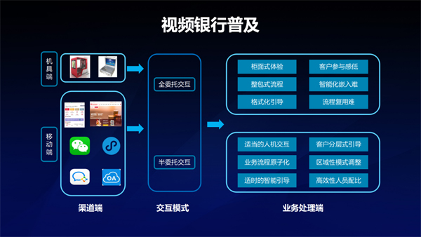 我們可以通過(guò)移動(dòng)手機(jī)里的小程序、APP等享受到現(xiàn)在像微信一樣的視頻服務(wù),下一步也可以通過(guò)撥打一個(gè)電話號(hào)碼直接進(jìn)入我們的銀行進(jìn)行視頻的請(qǐng)求。視頻交互方式有兩種,可以是全委托的交互方式,因?yàn)橐曨l的過(guò)程全程錄制,可以完全委托業(yè)務(wù)處理人員辦理,也可以自助式地辦理業(yè)務(wù),如果出現(xiàn)問(wèn)題再找服務(wù)人員進(jìn)行協(xié)同。所以視頻銀行的應(yīng)用十分豐富。