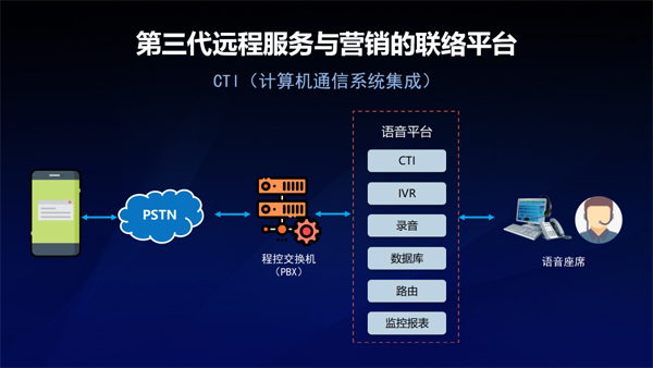 第三代聯(lián)絡(luò)中心在交互式語(yǔ)音應(yīng)答平臺(tái)的基礎(chǔ)上增加了計(jì)算機(jī)和通訊系統(tǒng)集成,即把語(yǔ)音通訊平臺(tái)和計(jì)算機(jī)網(wǎng)絡(luò)數(shù)據(jù)庫(kù)完整連接起來(lái),遠(yuǎn)程中心就可以有效地進(jìn)行服務(wù)請(qǐng)求應(yīng)答,以及自動(dòng)化引導(dǎo)。這就是一個(gè)路由的概念。第三代存在很多缺陷:首先,需要配備非常昂貴的交換設(shè)備,設(shè)備一旦發(fā)生問(wèn)題,解決十分困難。其次,錄音設(shè)備、交互式語(yǔ)音應(yīng)答設(shè)備等系統(tǒng)還需要一些專用的板卡,這為服務(wù)和運(yùn)維帶來(lái)很多困擾。