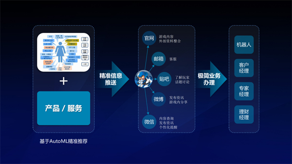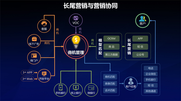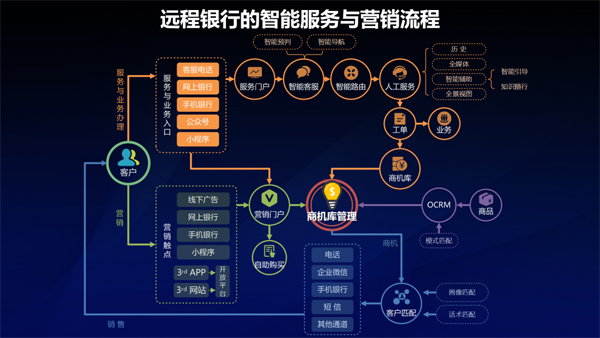 營(yíng)銷流程:從營(yíng)銷方面,銀行的營(yíng)銷很多是通過(guò)觸點(diǎn)營(yíng)銷,比如我們?cè)诰€下、網(wǎng)上、手機(jī)銀行、小程序上設(shè)立了很多觸點(diǎn),客戶可以通過(guò)觸點(diǎn)進(jìn)入到我們的營(yíng)銷體系購(gòu)買(mǎi)銀行的產(chǎn)品,這樣一些觸點(diǎn)我們稱為營(yíng)銷觸點(diǎn)。從營(yíng)銷觸點(diǎn)進(jìn)入以后,客戶又可以進(jìn)入到營(yíng)銷門(mén)戶,完成自動(dòng)采購(gòu),譬如客戶能通過(guò)手機(jī)銀行直接購(gòu)買(mǎi)一款理財(cái)產(chǎn)品;對(duì)于大額產(chǎn)品來(lái)說(shuō),客戶也可以留下信息進(jìn)入到我們的商機(jī)庫(kù)進(jìn)行商機(jī)管理,銀行客戶經(jīng)理將通過(guò)商機(jī)庫(kù)獲得的信息進(jìn)行進(jìn)一步營(yíng)銷或是通過(guò)銀行大數(shù)據(jù)平臺(tái)的客戶資料,讓客戶和商品的匹配進(jìn)行進(jìn)一步的營(yíng)銷,這就是遠(yuǎn)程銀行智能服務(wù)營(yíng)銷的流程。