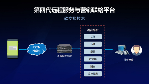 所以在2000年左右,出現(xiàn)了一個(gè)新的概念——軟交換,所謂的軟交換就是進(jìn)一步把通訊IT化,用IT的通用設(shè)備代替專用的通訊設(shè)備,讓專用的通訊設(shè)備退出歷史舞臺(tái)。所以第四代是通訊IT化。第四代用軟交換代替?zhèn)鹘y(tǒng)的語(yǔ)音交換機(jī),用基于軟件的語(yǔ)音應(yīng)答系統(tǒng)、錄音系統(tǒng)代替以前專用的板卡,形成了一個(gè)全軟平臺(tái)。目前,很多銀行在使用第四代,甚至還有一些平臺(tái)沒(méi)有完成第四代的迭代。第四代聯(lián)絡(luò)平臺(tái)從2000年起服務(wù)至今,系統(tǒng)的穩(wěn)定性、可靠性已經(jīng)得到了市場(chǎng)的充分認(rèn)證。