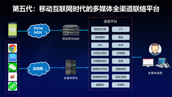 2012年開(kāi)始,第五代的聯(lián)絡(luò)中心開(kāi)始大規(guī)模發(fā)展,移動(dòng)互聯(lián)網(wǎng)時(shí)代和多媒體全渠道時(shí)代來(lái)臨。除了電話聯(lián)絡(luò)中心之外,互聯(lián)網(wǎng)聯(lián)絡(luò)也接入到聯(lián)絡(luò)平臺(tái)形成了全渠道多媒體聯(lián)絡(luò)。在全渠道、多媒體聯(lián)絡(luò)的過(guò)程中,強(qiáng)調(diào)的是服務(wù)的跨渠道一致性、統(tǒng)一的路由、資源的合理匹配;而座席人員也可以通過(guò)多媒體的手段完成用戶交互,這就是移動(dòng)互聯(lián)網(wǎng)時(shí)代的多媒體多渠道聯(lián)絡(luò)平臺(tái),此時(shí)的聯(lián)絡(luò)平臺(tái)僅完成了和客戶之間的聯(lián)絡(luò)和信息溝通并未給業(yè)務(wù)價(jià)值及工作效率帶來(lái)顯著提升。