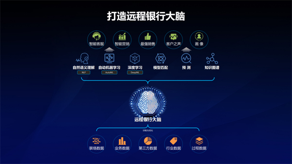 其實(shí)在銀行的應(yīng)用也相同,我們把銀行中積累的數(shù)據(jù)去訓(xùn)練人工智能,讓人工智能形成我們銀行的服務(wù)模型和營(yíng)銷模型隨后形成遠(yuǎn)程銀行大腦。它的訓(xùn)練者使用的是數(shù)據(jù),這數(shù)據(jù)就包括我們?cè)诳蛻袈?lián)絡(luò)過(guò)程中的聯(lián)絡(luò)數(shù)據(jù)、業(yè)務(wù)處理過(guò)程中的業(yè)務(wù)數(shù)據(jù),我們?cè)诤偷谌降慕换ミ^(guò)程中形成的第三方數(shù)據(jù)、行業(yè)數(shù)據(jù)、過(guò)程數(shù)據(jù)等,用這些數(shù)據(jù)訓(xùn)練我們的遠(yuǎn)程大腦,訓(xùn)練自然語(yǔ)義的理解,客戶意圖識(shí)別,自動(dòng)機(jī)器學(xué)習(xí),深度學(xué)習(xí)、模型的匹配、預(yù)測(cè)、知識(shí)圖譜等人工智能算法,然后去賦能我們的智能客服、銷售、客戶之聲、客戶畫(huà)像等,在不停優(yōu)化的過(guò)程中,又可以反向去挑選員工、優(yōu)化產(chǎn)品、優(yōu)化流程,逐步形成遠(yuǎn)程銀行大腦,而遠(yuǎn)程銀行大腦就是銀行的人工智能大腦,讓銀行變得更加聰明。
