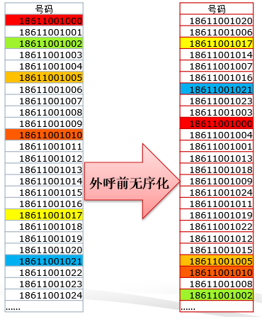 在號碼側(cè),采用外呼號碼無序化處理。即將所有批次號碼進行混雜,使整個外呼活動的接通率保持在一個相當穩(wěn)定的區(qū)間。
