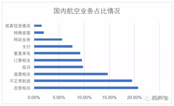 前面說的呼叫中心均是以電話為主要的服務(wù)渠道。在2000年,伴隨著互聯(lián)網(wǎng)以及移動(dòng)通信的發(fā)展與普及,將電子郵件、電商網(wǎng)站、微信、微博、APP等渠道接入呼叫中心,成為第四代呼叫中心的標(biāo)志,更有甚者,依托于人工智能技術(shù),還可以實(shí)現(xiàn)人機(jī)的文本交談、語音互動(dòng)、視頻互動(dòng)等溝通方式。在新媒體的呼叫中心技術(shù)在航空公司同樣有著重要的發(fā)展?jié)摿?。根?jù)統(tǒng)計(jì)數(shù)據(jù)分析,現(xiàn)在航空公司呼叫中心受理客戶來電主要分布情況如下: