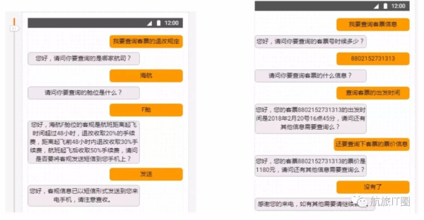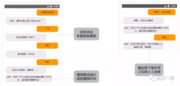 2、航班預(yù)訂。通過人機(jī)交互,把查詢環(huán)節(jié)交給機(jī)器人,可以降低70%的通話時(shí)長(zhǎng)。