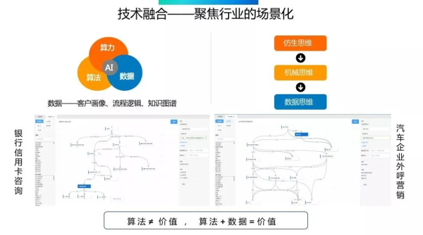 再回歸到我們智能業(yè)務(wù)場景本身,大家可以看到上面兩張類似不少,這是銀行、汽車客戶的兩個典型的業(yè)務(wù)流程圖曲里拐彎的,這也是當(dāng)下AI提供能力的基礎(chǔ)。數(shù)據(jù)其實就是與行業(yè)、業(yè)務(wù)結(jié)合的客戶畫像、流程邏輯、知識圖譜等大量的信息。因此,我們說算法不等于價值,算法+數(shù)據(jù)、+業(yè)務(wù)才有價值。AI與業(yè)務(wù)結(jié)合,每個行業(yè)在服務(wù)提升上,都可以有深入研究應(yīng)用空間。不僅僅解決簡單重復(fù)性的問題,也能解決復(fù)雜的、創(chuàng)造性的智能交互場景。比如抽油煙機(jī)、比如教育。