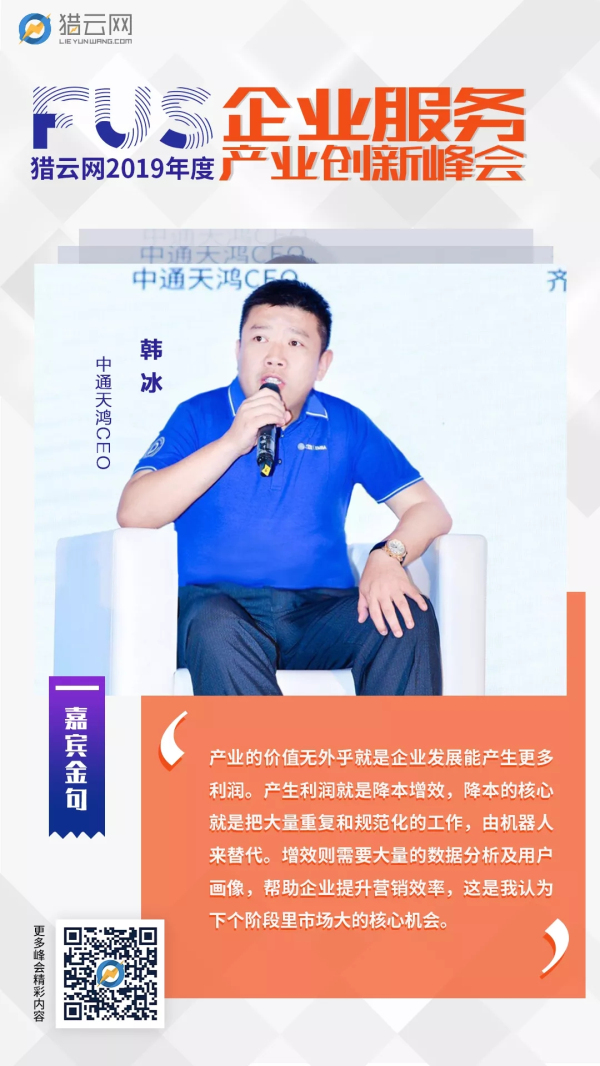 產(chǎn)業(yè)的價(jià)值無(wú)外乎就是企業(yè)發(fā)展能產(chǎn)生更多利潤(rùn)。產(chǎn)生利潤(rùn)就是降本增效,降本的核心就是把大量重復(fù)和規(guī)范化的工作,有機(jī)器人來(lái)替代。增效則需要大量的數(shù)據(jù)分析及用戶畫像,幫助企業(yè)提升營(yíng)銷效率。這是我認(rèn)為下個(gè)階段里市場(chǎng)的核心機(jī)會(huì)。