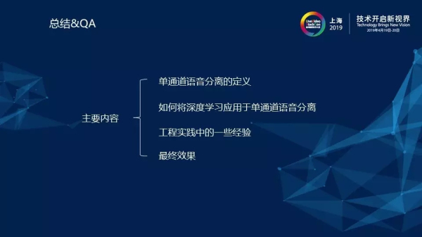 最后,就是本次的總結(jié)部分了。本次演講內(nèi)容首先是介紹了單通道語音分離的定義,其中語音分離方法我們介紹了三種,主要是以降噪為例去講的,因?yàn)榻翟胧潜容^關(guān)鍵的,再就是介紹了在單通道語音分離里面遇到的一些挑戰(zhàn),以及我們是如何去解決所遇到的困難的。