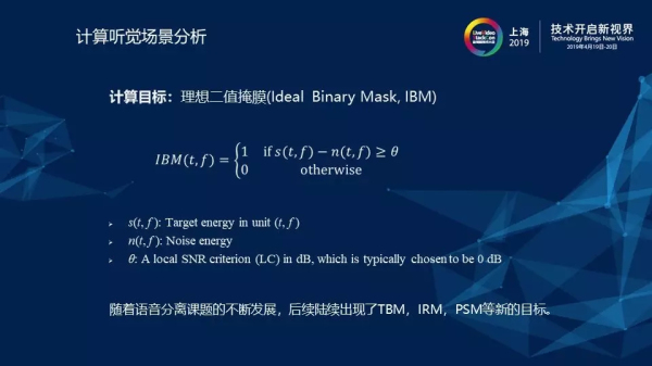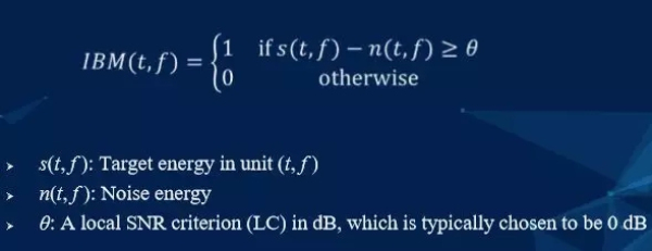接下來,我們再來看IBM的計(jì)算公式,公式里面的IBM其實(shí)就是深度學(xué)習(xí)最終預(yù)測的目標(biāo),IBM計(jì)算所得的值為0和1,即可認(rèn)為把最終結(jié)果分類成0和1,那么如何去界定0和1呢?界定條件如下:如果語音的能量s減去噪音的能量n大于一個(gè)θ值,θ一般取值為0,此時(shí)IBM的值為1,即我們認(rèn)為語音比噪音大的地方,IBM是1;同樣地,我們認(rèn)為語音比噪音小的地方,IBM是0,即認(rèn)為是噪音。這解釋了為何將在之前圖中第二層從左到右的第一張圖譜覆蓋到第一層從左到右的第二張圖譜上所得的信號(hào)與純凈語音是有差距的。而這樣做的好處就是成功將一個(gè)回歸問題改變?yōu)榉诸悊栴},只需要預(yù)測它是0或者1就可以了,這就使得學(xué)習(xí)難度變小,更容易預(yù)測。但不好的地方就是聽上去語音會(huì)有些許失真。但在2013年,當(dāng)時(shí)這個(gè)方法所取得的效果已經(jīng)算是非常好的。在此之后,陸續(xù)又有人提出了其他的一些計(jì)算目標(biāo),如TBM、IRM等,而這些目標(biāo)其實(shí)都與IBM是相似的,只是進(jìn)行了一些修正改進(jìn),例如IRM的值不僅僅只是0和1了,當(dāng)我們認(rèn)為它有一半的部分是語音,那么我們的目標(biāo)值就是0.5.當(dāng)前我們所采用的計(jì)算目標(biāo)大多數(shù)是IRM。