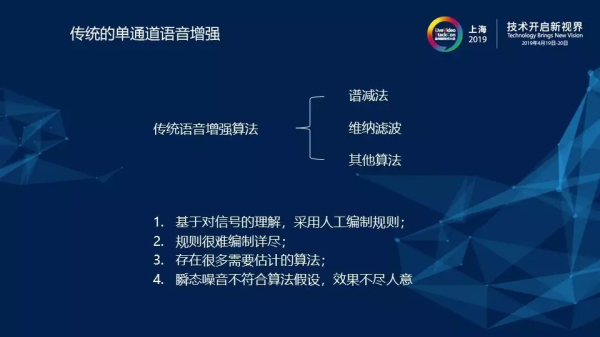 最后,總結(jié)一下傳統(tǒng)語音增強(qiáng)算法的特點(diǎn):1)傳統(tǒng)方法是基于對(duì)信號(hào)的理解,采用人工編制的一些規(guī)則;2)由于規(guī)則是人工編制的,這就導(dǎo)致存在規(guī)則很難編制詳盡的問題;3)存在很多需要估計(jì)的算法,通過對(duì)噪音調(diào)參得到適配的參數(shù)的調(diào)參過程十分考驗(yàn)人對(duì)于信號(hào)的理解以及自身經(jīng)驗(yàn)的豐富程度;4)最后一個(gè)也是最重要的問題就是瞬態(tài)噪音,瞬態(tài)噪音不符合算法假設(shè),傳統(tǒng)方法對(duì)它的處理結(jié)果基本上都是不盡如人意的。
