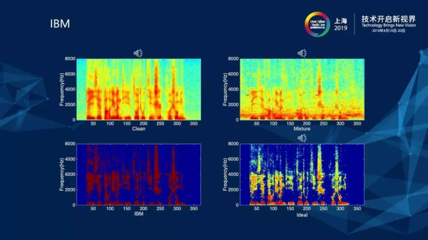 對(duì)于這一部分,首先為大家分享一個(gè)概念——計(jì)算聽覺場景分析,這套理論的主要貢獻(xiàn)者之一是我們的首席科學(xué)家汪德亮教授,他于2001年提出理想二值掩膜(Ideal Binary Mask,IBM),并將預(yù)測IBM作為計(jì)算聽覺場景分析解決語音分離問題的計(jì)算目標(biāo)。上圖是IBM的相關(guān)計(jì)算公式,為了方便講解,我們先拋開公式,看下面的四張語音的圖。