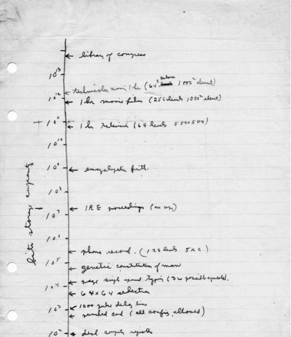 1949年夏的一天,香農(nóng)用鉛筆在活頁紙上自上而下而下的畫了一條豎線,并在旁邊寫下了10的冪,從100到1013。他將坐標(biāo)軸命名為比特存儲容量。然后他開始列舉一些可以儲存的東西,在103下,香農(nóng)寫下了打孔卡片,在104處,他寫下了單行距打字頁面(有32種可能),在105附近,他寫下了不同尋常的東西:人類的基因構(gòu)成,這種科學(xué)思考可謂史無前例,因?yàn)槿祟惖腄NA結(jié)構(gòu)要等上幾年才會被提出,香農(nóng)還是猜的太保守了,起碼低了四個(gè)數(shù)量級。在107的級別上,是一本厚厚的《無線電工程師學(xué)會學(xué)報(bào)》,在109級別,則是《不列顛百科全書》,1011比特是一小時(shí)的電視節(jié)目,而一小時(shí)的彩色電影,就要超過1013比特了。最后,就在下1014,香農(nóng)寫下了他所能想象的最大信息量:美國國會圖書館。