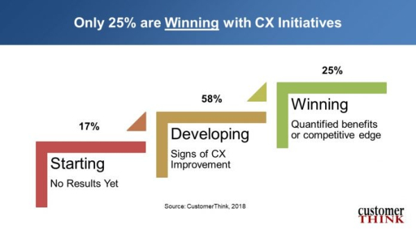 在行業(yè)層面,F(xiàn)orrester的CX研究發(fā)現(xiàn)了廣泛停滯。此外,Customer Think的研究發(fā)現(xiàn),只有25%的CX計劃(資金和人員)聲稱可以量化其商業(yè)價值或競爭優(yōu)勢。
