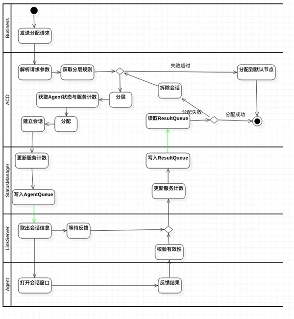 ACD是IM+系統(tǒng)的核心模塊,其主要功能是實現(xiàn)客人坐席分配,ACD指令和消息的收發(fā)、ACD會話管理等。其處理流程如下:
