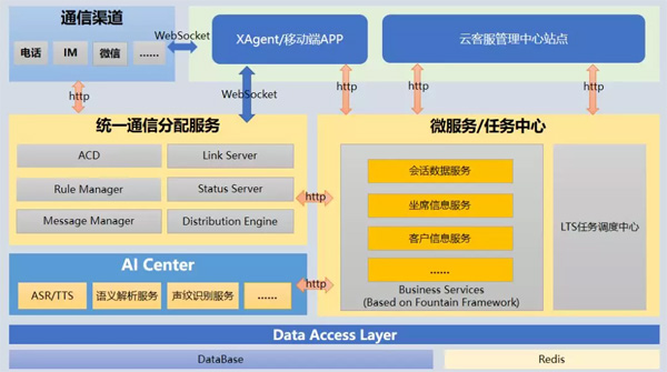 通信渠道由我們自研的各渠道Server構(gòu)成,其中也包括無線平臺研發(fā)部所研發(fā)的IMServer。坐席所使用的全渠道通信端(XAgent/APP)使用WebSocket協(xié)議與這些渠道Server保持通信,同時也使用WebSocket協(xié)議與統(tǒng)一通信分配服務(wù)保持通信。
