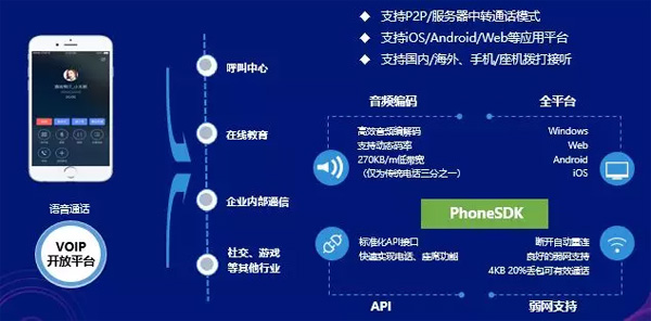 VOIP也就是大家所熟知的IP網(wǎng)絡(luò)電話。我們的平臺提供了VOIPSDK,方便第三方應(yīng)用集成,并且自研了音頻編解碼和動態(tài)碼率技術(shù),能夠滿足弱網(wǎng)下的正常語音通信。其特性如下圖所示: