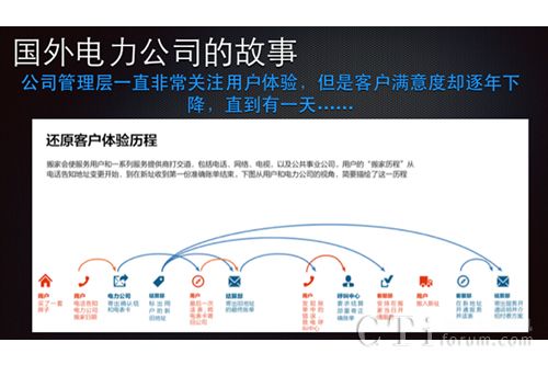 經(jīng)過流程的梳理,大家發(fā)現(xiàn)一個(gè)標(biāo)準(zhǔn)的用戶搬遷流程中,電力公司與用戶的接觸點(diǎn)一共有19個(gè)。每個(gè)觸電,電力公司的員工都完成的非常出色。然而,觸點(diǎn)與觸點(diǎn)之間沒有整合和過度。用戶搬遷的請求并沒有以一個(gè)用戶、一個(gè)需求的形式貫穿電力公司的整個(gè)服務(wù)流程。用戶感覺和好幾個(gè)電力公司在打交道;而電力公司感覺收到個(gè)幾十個(gè)客戶請求,但是不知道來自于同一個(gè)客戶。