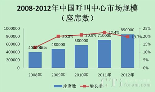 呼叫中心進入中國已有較長一段時間,從最初的通信、金融行業(yè),目前已輻射到各行各業(yè)。截止2012年底,中國呼叫中心座席總數(shù)達到850,000個,市場累計規(guī)模為691.2億元。