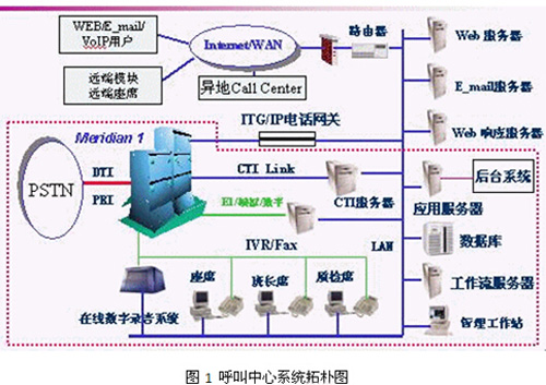 系統(tǒng)報(bào)表顧名思義就是從系統(tǒng)里出具的報(bào)表,是運(yùn)營原始數(shù)據(jù),呼叫中心的系統(tǒng)構(gòu)成比較復(fù)雜,在沒有一體機(jī)的時(shí)代,呼叫中心的機(jī)房是一個(gè)很宏偉的地方,那里通常有很多機(jī)架,很多線纜,遍布著交換機(jī)、服務(wù)器、UPS、語音板卡和各種各樣的中間設(shè)備,對于不懂系統(tǒng)的人來說是一個(gè)讓人望而生畏的地方。但是系統(tǒng)部署卻是呼叫中心管理者必須要面對的問題,因?yàn)樗膬?yōu)劣對于呼叫中心的運(yùn)營影響很大,通常在了解系統(tǒng)構(gòu)造的時(shí)候,系統(tǒng)集成商應(yīng)該提供一張呼叫中心的拓?fù)鋱D,這張拓?fù)鋱D以功能方式提供說明,而不是設(shè)備型號(誰知道哪個(gè)設(shè)備型號對應(yīng)的是哪個(gè)交換機(jī)呢)。下面這張圖就是一個(gè)呼叫中心系統(tǒng)的拓?fù)鋱D。