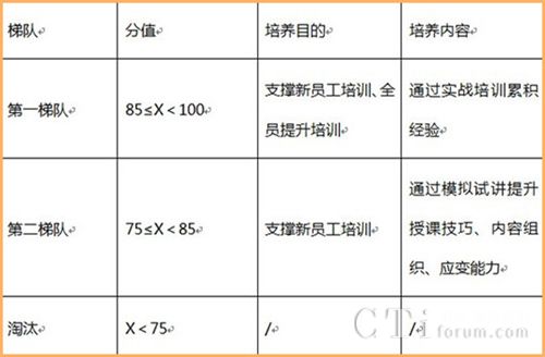 兩至三次試講之后,可根據(jù)最后一次試講評價(jià)的結(jié)果分梯隊(duì)開展虛擬團(tuán)隊(duì)培訓(xùn)師的培養(yǎng),參考分隊(duì)標(biāo)準(zhǔn)參考如下: