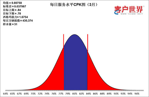 而對(duì)于定量測量和分析流程的方法,可以用折線圖查看趨勢(shì),或CPK圖查看流程西格瑪來確認(rèn)改善效果。下圖是某移動(dòng)公司實(shí)施流程改善后在服務(wù)水平指標(biāo)上的CPK圖對(duì)比,上圖為改善前的CPK圖,缺陷率為77.9%(根據(jù)DPM測算),而經(jīng)過流程測量、流程分析、流程改善,最終改善的結(jié)果如下圖,缺陷率降至53%,流程西格瑪能力從0.7284上升到1.4227,從流程輸出來評(píng)估,改善體現(xiàn)了效果,當(dāng)然,53%的缺陷率還是有很大的提升空間。