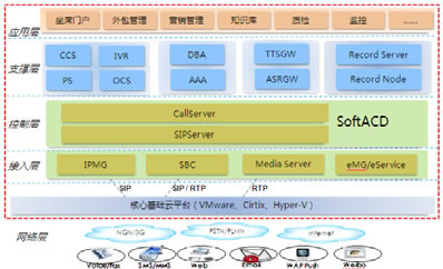 此層包括所有網(wǎng)絡(luò)資源和特殊資源,如SoftACD、媒體網(wǎng)關(guān)(MG)、視頻服務(wù)器、即時消息服務(wù)器等,提供通訊和數(shù)據(jù)網(wǎng)的接入控制。它將語音、視頻、短信、WAP等各電子渠道的服務(wù)請求通過協(xié)議轉(zhuǎn)換統(tǒng)一接入到IP網(wǎng)絡(luò)中,即對用戶端來說實(shí)現(xiàn)多媒體渠道統(tǒng)一接入。