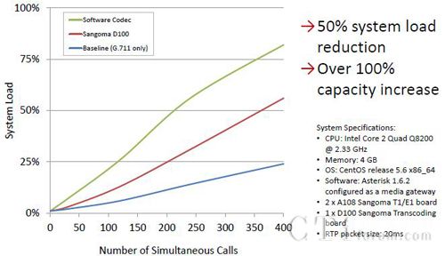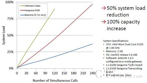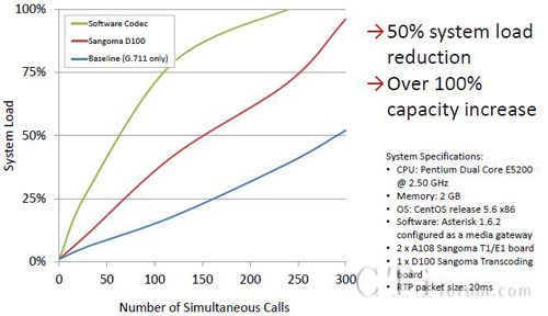 通過兩組結(jié)果的對比,可以發(fā)現(xiàn),同樣CPU,同樣的Asterisk軟交換平臺使用硬件編碼轉(zhuǎn)換卡比使用軟件編碼可以降低系統(tǒng)CPU負載50%,同時處理能力增加了100%。所以筆者建議,在比較大型(至少100路以上)的呼叫會話處理環(huán)境下,建議用戶使用Sangoma硬件編碼轉(zhuǎn)換卡做語音編碼解決方案。